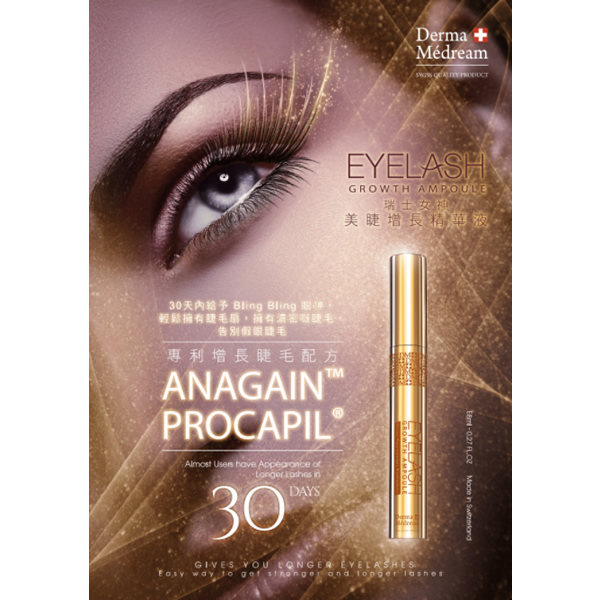 源自瑞士的專利配方Anagain™,有機豌豆苗提取物,測試証實,能喚醒沉睡毛囊,刺激根部的睫毛生長並恢復睫毛毛囊生長力,重新激活生長期的睫毛,延長睫毛生命週期,防止毛囊衰老,刺激細胞更生並減少睫毛折斷。